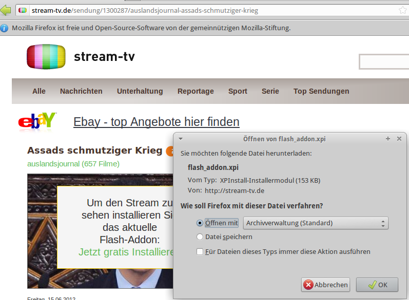 "Als Trojanisches Pferd (englisch Trojan Horse), im EDV-Jargon auch kurz Trojaner genannt, bezeichnet man ein Computerprogramm, das als nützliche Anwendung getarnt ist, im Hintergrund aber ohne Wissen des Anwenders eine andere Funktion erfüllt." (Wikipedia)Welcher der oben genannten Paragraphen auf die Tätigkeit des Marco Remmert von der Advertiso GmbH anzuwenden ist mag ich nicht entscheiden, aber ein Trojaner ist es, was der feine und saubere Hamburger da als "Flash-Addon" anbietet. Geschrieben hat er das Ding übrigens nicht. Zusammenkopiert vielleicht. Und zum Glück funktioniert der Dreck auch nicht. Leider gilt das nur unter Linux. Unter Windows geht der Dreckstrojaner schon, wie ich im zweiten Durchgang feststellen musste.