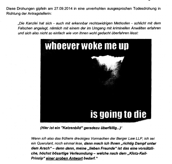 Die zweite Lüge im gleichen Satz war: "in Richtung der Antragstellerin" - mal wieder war die Vorhaltung nämlich an die "frühere "Berger Law LLP" bzw. die jetzige "Kanzlei Buchholz und Kollegen" bzw. "Blazevska und Partner" (Philipp Berger, Andreas Buchholz und nun auch Adrijana Blazevska)" adressiert. Man muss nur lesen können und wollen um das zu wissen - oder halt zu erfahren, wie dämlich die von Doktor Ruben Engel von der Kanzlei Ralf Höcker in Köln zu Papier gebrachte Lüge ist